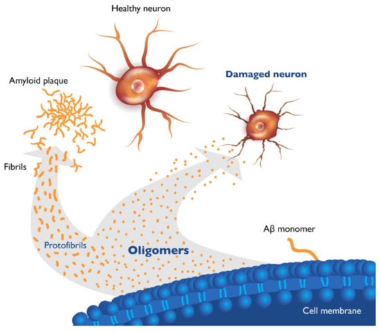The Aβ monomer peptide is a proteolytic derivative of the large transmembrane amyloid precursor protein (APP) and is formed by the sequential enzymatic cleavage of APP [29]. Aβ monomers exist as peptides of several lengths, cleave from the neuronal cell membrane, and, in the setting of impaired clearance from the brain caused by aging or genetics, aggregate to form soluble Aβ oligomers of increasing molecular weight [30,31,32], ultimately forming insoluble amyloid fibrils and plaques (Figure 1). The most abundant Aβ monomer in the brain is Aβ40, while the Aβ42 monomer is the most prone to misfolding and aggregation, and is the major form involved in seeding amyloid aggregates and oligomer formation.