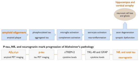Fluid and imaging biomarkers detect and track progression of pathological processes in Alzheimer’s disease (AD). The core pathologies of AD can now be detected in patients using validated cerebrospinal fluid (CSF) assays for Aβ42, Aβ40, and several isoforms of p-tau. These CSF biomarkers of soluble amyloid and p-tau species indicate a pathological state, while the positron emission tomography (PET) scans show the actual accumulation of insoluble amyloid and tau over time. The toxic downstream effects of amyloid oligomers can be assessed using CSF and plasma biomarkers of neurodegeneration (neurofilament light chain protein (NfL) and total tau) and a biomarker of synaptic injury (neurogranin). Neuroinflammation can be assessed in CSF using the microglial marker (sTREM-2) and astrocytic marker (YKL-40), and in plasma using the astrocytic marker glial fibrillary acidic protein (GFAP) [43]. Insoluble fibrillar amyloid and aggregated tau in NFTs can be visualized and evaluated quantitatively by amyloid and tau PET imaging [8,9,10]. The use of volumetric magnetic resonance imaging (MRI) is well established in AD, accurately detects hippocampal and cortical atrophy reflecting neuronal cell loss and gliosis, and correlates with progression of disease.