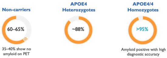 In longitudinal AD studies evaluating the natural history of the disease, and in clinical trials, APOE4 carriers show very high rates of amyloid positivity, dramatically improving the diagnostic accuracy of AD in therapeutic trials involving these patients. Amyloid PET data from 390 patients with Mild to Moderate AD showed a mean prevalence of amyloid positivity of 95% in APOE4/4 homozygotes and 88% in APOE4 heterozygotes, compared to ~60% in non-carriers [57], indicating a problematic 40% rate of clinical misdiagnosis in APOE4 non-carriers (Figure 4). Therefore, APOE4 genotyping can be used to substantially improve diagnostic accuracy in AD patients for trials and in clinical practice.