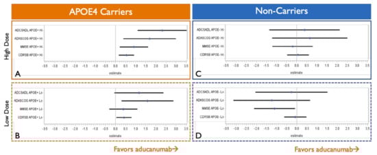 Carriers of ε4 allele of apolipoprotein E (APOE4) drive the overall efficacy of aducanumab in the EMERGE Phase 3 study. Only a single EMERGE Phase 3 trial showed clinical efficacy of aducanumab. Diagrams adapted from the FDA Advisory Committee Briefing Book illustrate point estimate effects of aducanumab in the EMERGE trial on a functional (Alzheimer’s Disease Cooperative Study—instrumental Activities of Daily Living Inventory (ADCSADL)), cognitive (Alzheimer’s Disease Assessment Scale—Cognitive subscale (ADAS-Cog) and Mini-Mental State Examination (MMSE)), and a composite clinical outcome (Clinical Dementia Rating—Sum of Boxes (CDRSB)). Panels (A) and (B) show effects of high and low doses in APOE4 carriers, and panels (C) and (D) show effects in APOE4 non-carriers, suggesting that the overall efficacy of aducanumab is derived from the APOE4 carrier population with minimal clinical benefits observed in APOE4 non-carriers [68].