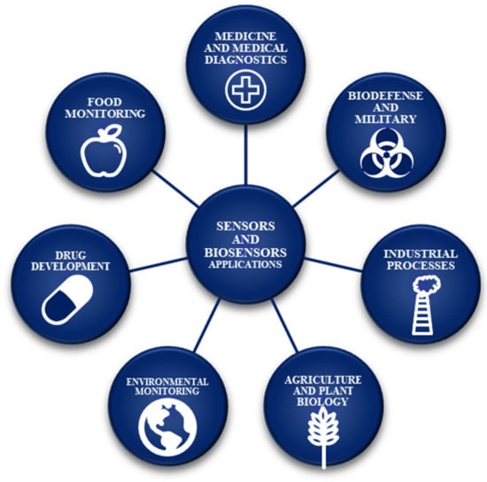 In medicine and clinical diagnostics, monitoring of compounds such as hormones, drugs, or protein markers is crucial for the prevention, diagnosis, control, and treatment of diseases. A glucometer, a sensor that measures the concentration of glucose in bodily fluids (usually in blood), remains one of the most commonly used biosensors in diagnostics, as it is essential for people suffering from diabetes []. Although metals are present in everyday life, in industry, and are necessary for many biological functions, e.g., for enzyme activity, some of them also pose a risk to the environment and health, which is why sensors with the ability to detect trace amounts of hazardous heavy metal ions are required []. Various other applications of sensors and biosensors are presented in Figure 1.