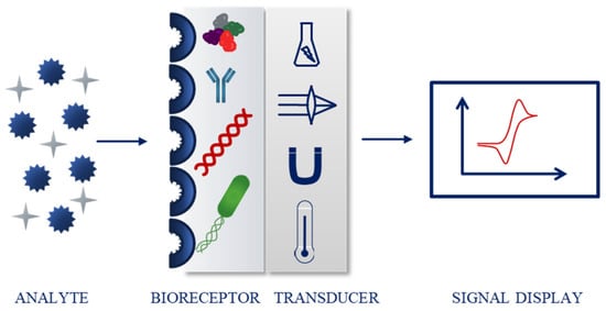 In 1991, the International Union of Pure and Applied Chemistry (IUPAC) defined a chemical sensor as a device capable of transforming chemical information into a signal that can be processed. The two main components of the sensor are a receptor, which changes the chemical information into a form of energy that can be measured and then transformed by the second important part, a transducer (Figure 2). Both physical and chemical principles can be the base of the receptor part, which is responsible for the recognition of the analyte. If the recognition process is based on a biochemical reaction, the sensor is considered a biosensor [].