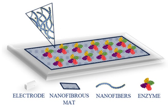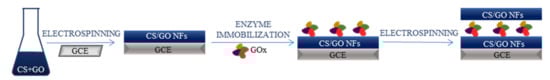 Mehdizadeh et al. also used chitosan to prepare glucose sensor-CS/GO nanofibers, with the enzyme trapped between two NFs layers, which were used to modify a GCE []. The NFs were electrospun directly on the electrode surface. The average diameter was between 105.11 and 386.49 nm, depending on the GO concentration. Then, the enzyme was immobilized on the nanofibers and after drying, another layer of NFs was deposited on the first layer to ensure that the enzyme stayed on the NFs (Figure 8). Obtained nanostructures were analyzed using, i.a., microscopy, XRD, and FT-IR. Electrochemical studies were performed using CV with a conventional three-electrode system (modified GCE, Ag|AgCl and a Pt wire served as working, reference, and counter electrodes, respectively). The sensor presented linearity in a range of 0.05–20 mM, good selectivity and stability, and the detection limit was found at 0.02 mM.