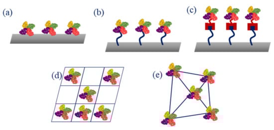 A (bio)sensor should possess several properties or characteristics that provide accurate and satisfying performance. Those include independence of physical limitations (e.g., pH or temperature), selectivity (ability to detect specific analyte from a sample), sensitivity (low limit of detection, LOD), linearity and linear range (connected to accuracy), stability (over time and in various conditions), response time, and reproducibility (repeating the experimental set-up with the same response) []. In the case of biosensors, the immobilization of biomolecules, such as enzymes, antibodies, and nucleic acids, is crucial for the biorecognition to occur (Figure 3).
