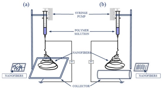 Schematic electrospinning setup: (a) with a plate collector; (b) with a rotary collector.