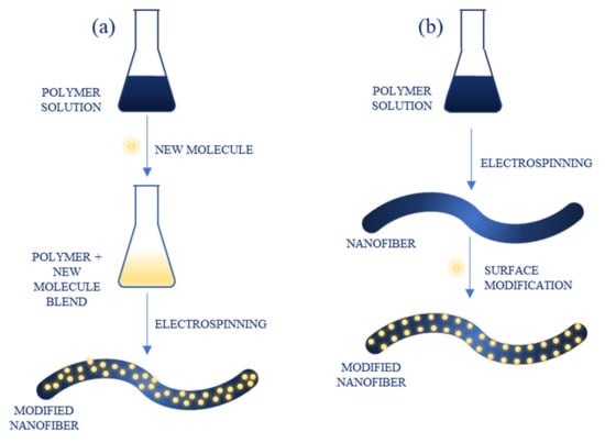 Functionalization of nanofibers through: (a) direct blending; (b) surface modification.