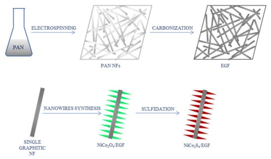 Schematic process of the synthesis of NiCo2S4-modified graphitic nanofibers []; PAN—polyacrylonitrile, NFs—nanofibers, EGF—electrospun graphitic nanofiber film.