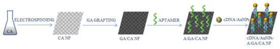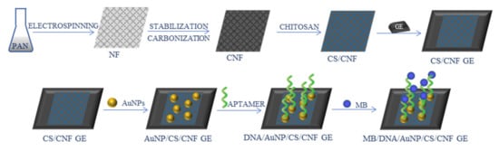 An aptasensor for Salmonella enterica serovar was developed by Fathi et al. []. CNFs (average diameter 90 ± 10 nm) were fabricated from PAN precursor, mixed with CS, and deposited on a pencil graphite electrode. The surface of the electrode was further modified with AuNPs, an aptamer, and methylene blue (MB) (Figure 9). The obtained sensor was electrochemically characterized by CV and EIS techniques. The LOD was found at 1.223 CFU/mL, and the sensor showed a wide linear range of 10–105 CFU/mL, good selectivity, reproducibility, and stability.