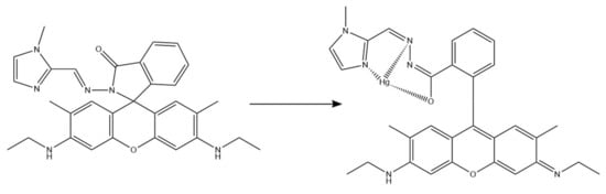 For optical mercury ions sensing, Rao et al. developed a colorimetric and turn-on fluorescence chemosensor based on rhodamine 6G []. They synthesized a rhodamine derivative functionalized with N-methyl imidazole unit (RIM), which was added to polyurethane (PU) solution to obtain nanofibers. The sensing performance was tested with UV-Vis and fluorescence emission, and 1H NMR and electrospray ionization mass spectrometry methods were used to understand the binding mechanism between Hg2+ and RIM (Figure 10). In both day and UV light, an instant color change (from colorless to pink and fluorescent yellow, respectively) was noticeable in the solution containing RIM and Hg2+ ions, with no change in case of different ions, proving that the sensor was selective. Similarly, Hg2+ was the only tested metal ion (out of 16) that produced an additional peak on absorption and fluorescence emission spectra (at 538 nm and 562 nm, respectively). The use of NFs allowed a rapid, colorimetric, on-site detection of mercury ions, as prepared RIM-NFs strips changed the color to pink under UV light upon Hg2+ addition.