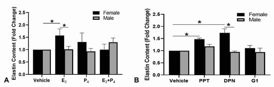 E2 is known to be mitogenic and as such could be a potential confounding factor when studying elastin content [,]. To ensure that the differences in the elastin content were due to elevated expression of elastin rather than increased cell number, the DNA content was determined for all EDS. The elastin content was normalized to DNA content before determining fold change. To look at overall cellularity, the DNA contents were normalized to protein content to account for any differences in tissue size. There were no significant changes in DNA content for any conditions when evaluated as content alone or as fold change compared to vehicle control. The female EDS and male EDS cultured with the vehicle control contained 3.51 ± 1.67 and 3.86 ± 1.31 µg DNA/mg protein content, respectively. When cultured with E2, the contents were 3.56 ± 1.18 and 3.72 ± 0.74 µg DNA/mg protein content, which represents a change of 1.01 ± 0.11-fold and 1.03 ± 0.25-fold compared to the vehicle for female and male EDS, respectively.