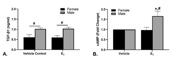 TGF-β1 and cAMP concentrations after E2 culture. (A) The concentration of TGF-β1 was higher in male cultures than in female cultures but was not affected by treatment. (B) The presence of cAMP in the male tissues treated with E2 was significantly higher than that of females and the vehicle control. n = 5; * indicates p < 0.05 compared to vehicle control; # indicates p < 0.05 compared to the opposite sex.
