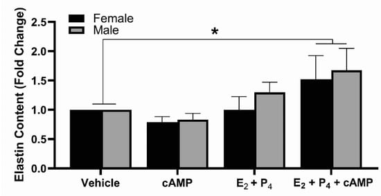 The addition of cAMP alone did not lead to an increase in elastin synthesis; however, when combined with E2 and P4 elastin synthesis significantly increased in both male and female EDS (Figure 4).