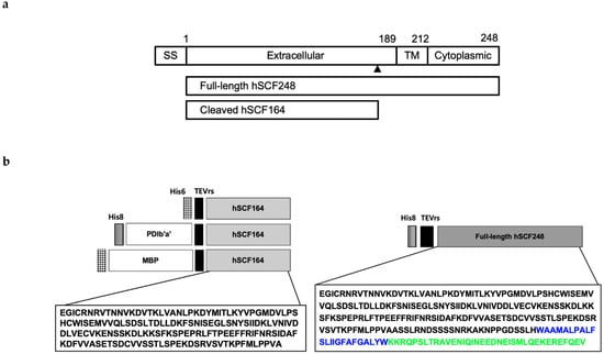 Splicing of hSCF mRNA produces two isoforms (His-hSCF248 and hSCF220) [,,]. Both isoforms are membrane proteins with a single transmembrane (TM) domain. The longer His-hSCF248 contains a proteolytic cleavage site such that the truncated N-terminal hSCF (hSCF164) can be released from the extracellular domain of the protein (Figure 1a) [,,,]. At a low concentration similar to the physiological condition, hSCF164 exists mostly as a monomer []. The N-terminal 141 residues of hSCF have been identified as a functional core, which includes the dimer interface and portions that bind and activate the c-Kit receptor []. hSCF164 forms a noncovalently associated homodimer when it interacts with c-Kit to trigger receptor dimerization and signaling [,]. The hSCF contains four N-linked and three O-linked glycosylation sites [,]. However, glycosylation is not involved in the binding to the receptor [,].