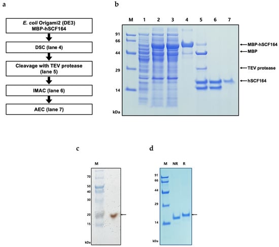 Purification of hSCF164 from MBP-hSCF164 in E. coli. (a) Flow chart of the purification steps. (b) hSCF164 was purified from MBP-hSCF expressed in E. coli Origami 2(DE3) using Dextrin Sepharose chromatography (DSC), immobilized metal affinity chromatography (IMAC), and anion-exchange chromatography (AEC). M, molecular weight size marker (homemade marker); lane 1, total cell proteins before IPTG induction as negative control; lane 2, total proteins induced by IPTG after cell sonication; lane 3, soluble proteins after cell sonication from total cell proteins; lane 4, MBP-hSCF fusion protein (62.4 kDa) purified with affinity chromatography; lane 5, result of TEV protease cleavage (28.6 kDa): MBP tag (43.9 kDa) and hSCF (18 kDa); lane 6, IMAC purification of hSCF164 after TEV cleavage; lane 7, hSCF164 (18 kDa) purified with ion-exchange chromatography. (c) Silver-stained gel under reducing conditions. M, molecular weight size marker. (d) Final purified hSCF164 under reducing and nonreducing conditions. M, molecular weight size marker (homemade marker); R, reducing; NR, nonreducing.