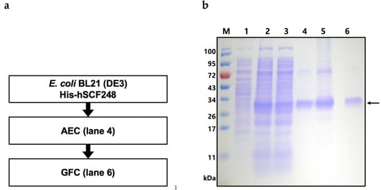 Purification of full-length His-hSCF248 from E. coli. (a) Flow chart of the purification steps. AEC, anion-exchange chromatography; GFC, gel filtration chromatography. (b) His-hSCF248 was purified using AEC and GFC. M, molecular weight size marker; lane 1, total cell proteins before IPTG induction as negative; lane 2, total proteins induced by IPTG after cell sonication; lane 3, soluble proteins after cell sonication from total cell proteins; lane 4, His-hSCF248 (31.9 kDa) purified with AEC; lane 5, concentrated His-hSCF248; lane 6, His-hSCF248 purified with GFC.