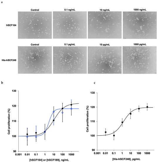 TF-1 cell proliferation assays of commercial hSCF164, and purified hSCF164 and His-hSCF248. (a) Microscope images of TF-1 cell growth that was promoted by treatment with purified hSCF164 and His-hSCF248 for 12 h. (b) Dose-dependent cell proliferation by hSCF164 (black closed circle) and commercial hSCF189 (blue open circle). (c) Dose-dependent cell proliferation by His-hSCF248.
