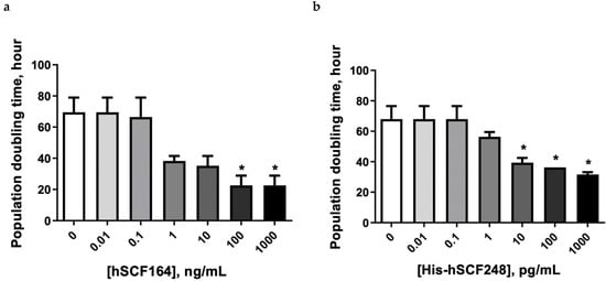 hSCF164 and His-hSCF248 effect on doubling time of TF-1 cells. Dose-dependent cell doubling time (h) was changed by treatment with hSCF164 (a) and His-hSCF248 (b). Data are presented as the mean ± SEM (n = 4). One-way ANOVA and Dunnett post hoc test (* p < 0.05).