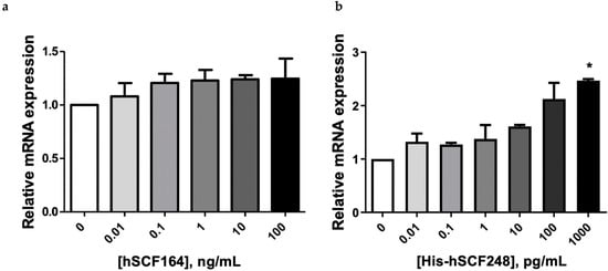 Expression levels of c-Myc mRNA by treatment with hSCF164 and His-hSCF248 in TF-1 cell line. Dose-dependent gene expression changes by treatment with hSCF164 (a) and His-hSCF248 (b). Gene expression was normalized to RPL mRNA expression. Data are presented as the mean ± SEM (n = 4). One-way ANOVA and Dunnett post hoc (* p < 0.05).
