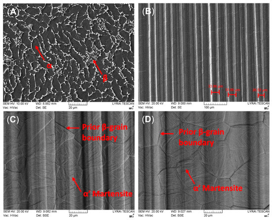 Figure 1A shows the initial microstructure of Ti6Al4V alloy. It consists of lamellar α-grains with an intergranular β phase. Figure 1B displays the orientated structure with deep grooves on the surface of titanium alloy after EBM. SEM measurements of densities of irregularities on the alloy’s surface are shown in Figure 1B. The average distance between the grooves was found to be 42.67 ± 1.58 μm and 32.34 ± 0.82 μm for the AR850 and AR500 samples, respectively. Nonetheless, the average maximum peak-to-valley (Rz) values were equal to 5.84 ± 0.17 μm and 7.35 ± 0.21 μm, respectively. At higher magnification (Figure 1C,D), it could be seen that within the prior β grains, the microstructure consists of individual-oriented martensite laths with a width of above 1–2 μm, which are expected for the diffusionless transformed β-grains under rapid solidification conditions typical for EBM. The inclination angles in the obtained anisotropic structure follow Burger’s relation between prior β and α’ phases [52]. The lack of α-phase grains along the prior-β grain boundaries suggests that (1) the cooling rate after EBM is higher than 410 °C/s (the critical cooling rate for the displacive transformation of Ti6Al4V) [53] and (2) high thermal gradient (104–105 °C/cm) in the re-melted area [54]. The thermal effect of electron beam irradiation causes a surface with a large grain size after rapid re-solidification. The equiaxed β phase formation during heating is considered to be driven by reducing interfacial energy [55].