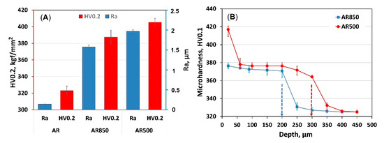 The hardness and surface roughness values plotted in Figure 2A are arithmetic mean values of 10 measurements per specimen with error bars representing ± standard error. The roughness and hardness results show that they increased significantly after EBM. The initial hardness of the alloy was 323 ± 5.6 HV0.2. Similar hardness values for the AR alloy were reported by [56], while Young’s modulus varied between 116–120 GPa [57]. The highest surface roughness (1.97 μm) and average hardness (405.4 HV0.2) were measured for AR500 samples followed by AR850 where the hardness was almost 387.5 HV0.2 whereas the Ra was equal to 1.58 μm. Similarly, nanoindentation measurements revealed an increase in hardness of electron beam additive manufactured Ti6Al4V with α’-martensite structure equal to 6.5 GPa while Young’s modulus did not change substantially (128 GPa) [58].