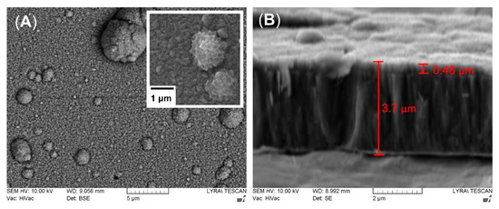 The surface structure of the deposited TiN/TiO2 coating (Figure 3A) is composed of islands (microparticles) protruding from the nitride sub-layer and covered with oxide crystals. Those large conglomerates of atoms are typical for cathodic arc deposited films and are thought to be the main drawback of this technique. They are formed during cathodic arc evaporation because of intense localized heating of the titanium target. As seen in Figure 3A, the microparticles’ size is not constant but droplets are homogeneously distributed in and over the coating. The droplet phase is characterized by its conical morphology. However, the resulting rougher morphology of the film could be beneficial for cell-implant interactions. It should also be considered that shallow potholes around these droplets in the film are possible [59]. However, the higher the applied substrate bias, the denser the coating. The cross-section structure revealed long and fine nitride columns extending from the substrate and thinner (about 0.48 μm) overlaying oxide layer (Figure 3B). The nitride layer morphology is predetermined by the high energy of the ionized particles. While the negative substrate bias repels the electrons, the energized ions are attracted by the negatively charged substrate with energy enough to sputter the surface atoms and diffuse to sites with lower energy that produce higher density films. Moreover, with the increase of the applied bias, the film becomes rougher because of the re-sputtering effect, which results from the competition between ion bombardments of the coating and the etching of the evolving film [60].