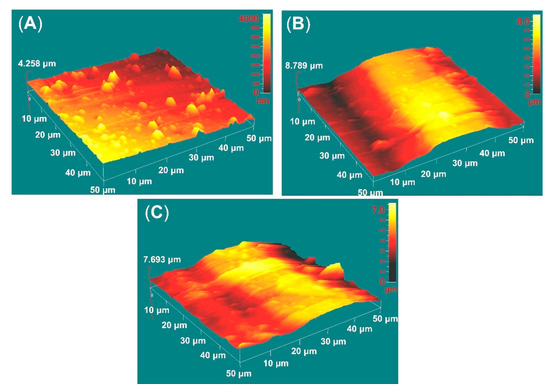 Figure 4 shows the AFM deflection images of the films deposited on AR and EBM samples. The average roughness data of the deposited films were obtained over an area of 50 × 50 μm and are presented in Table 3. The roughness values tend to increase after EBM of the substrate since the coating replicates the substrate morphology. The mean roughness (Sa) is over 2 times higher for the EBM-coated sample. In contrast to the previously measured Ra values by contact profiler, Sa of the coated AR sample is increased because of the presence of droplet phase, whereas the roughness values of EBM samples after coating did not change substantially (see Table 2 and Table 3) because of the pre-existing uneven morphology of the martensite laths (Figure 1C,D). Due to squaring the amplitude in its calculations, Sq (root mean square roughness) can be considered more sensitive to valleys and peaks than Sa. The vertical distance between the highest and the lowest points in the evaluated area (Rpv) is also considered important because it contains information about the extreme features of the surface. The skewness (Ssk) indicates heights’ distribution asymmetry, which in the case of complete symmetry is equal to zero. As seen in Figure 4A, the higher than zero AR sample values demonstrate that the heights are larger than the valleys, while those of AR500 samples are almost symmetrically distributed. For AR850, the valley areas predominate.
