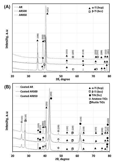 Figure 6 shows typical XRD spectra from the substrates and coatings. After EBM, the peaks corresponding to the β phase (JCPDS No. 09-0098, space group Im-3m) disappear because of the transformation of a large portion of β to α phase (JCPDS No. 01-1198, space group P63/mmc) near the surface. The decrease in (100), (110), (200), and (201) planes together with the increase in the intensity of (002), (101), and (102) planes of α-Ti indicate re-orientation in the micro-volumes of the α-phase grains and a change in texture (Table S1, Figure 6) after EBM. This re-orientation affects the texturing of overlying TiN (JCPDS No. 87-0633, space group Fm-3m) that changes from (220) on the AR substrate to strong (200) orientation when TiN was deposited on EBM substrates (Table S1). The average grain sizes of α-Ti, TiN, and TiO2 calculated by using Scherrer’s equation are shown in Table S2. Their values for all coated samples are close because the films are grown under the same experimental conditions.