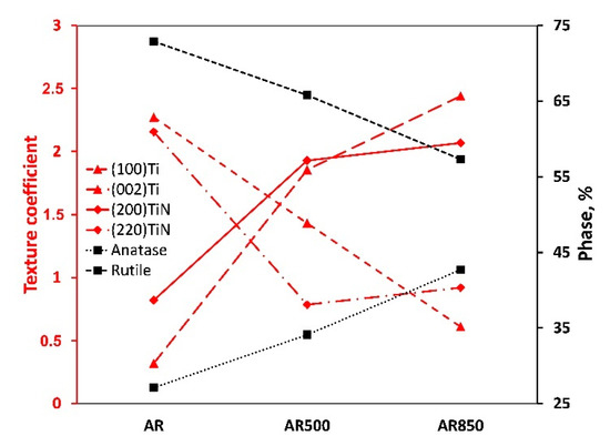 Texture coefficients of (100)Ti, (002)Ti, (200)TiN, (220)TiN, anatase, and rutile phase percentage in AR, AR500, and AR850.