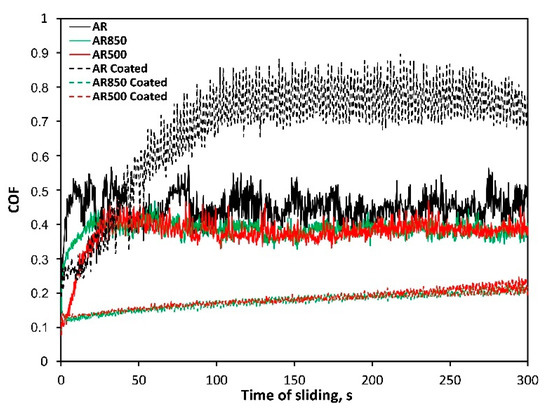The surface roughness and hardness are among the parameters that determine the quantity of friction. COF of the bare AR substrate fluctuates significantly, whereas those of EBM uncoated samples remained around 0.37–0.38 at a relatively steady stage (Figure 8). The reduction of COF is due to the increased surface hardness of the modified substrates unlike those of AR Ti6Al4V alloy. The wear profiles of rubbing ball surfaces indicate the lowest COF for EBM and coated samples compared to other contacting pairs. The wear resistance of coatings was compared by estimating the width of the wear track. Because of the ductile substrate, the severe friction between coated AR specimen and the ball turned from sliding into plowing [78] and greater surface damages due to the plastic deformation of the substrate (see Table 5, wear track width) were observed. The wear scar was about 552.4 μm in width. After a certain period, because of the interaction between the hard coating and ball material, abrasive wear took place that accelerated the wear of coating on the ball head as the wear test progressed.