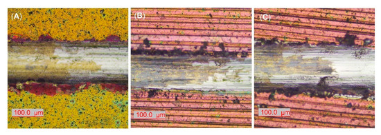 Representative micrographs of scratch tracks at adhesive critical loads (Lc) of (A) АR; (B) AR850; (C) AR500 samples.