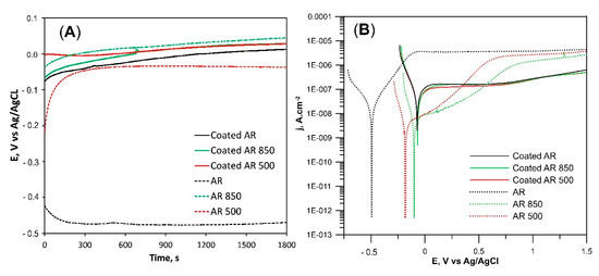 Figure 10A presents the open circuit potential (OCP) of all bare and coated samples. OCP kept shifting positively during immersion in PBS for all samples except for AR specimens. That positive shift is related to the generation or presence of passive film, and, therefore, the anodic process is the dominant electrode process. The OPC of AR was maintained at approximately −0.47 V vs. Ag/AgCl after 30 min of immersion in PBS which is much lower than that of EBM and coated samples.