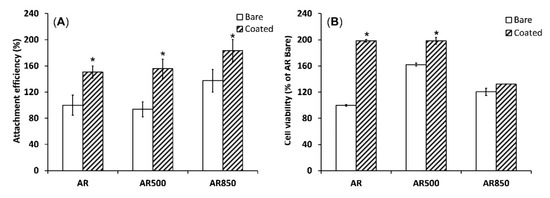 Cell attachment after 1 h (A) and cell viability evaluated by MTT assay (B) of MG63 growing on uncoated and coated samples for 24 h. * p < 0.01 compared to the AR sample, n = 2.
