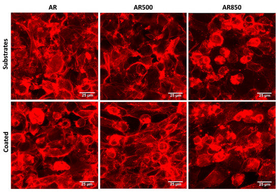The supportive effect of TiN/TiO2 coatings on cell adhesion and viability was demonstrated when the polished AR sample was compared to the polished and EBM-coated samples. Compared to the uncoated group, TiN/TiO2-coated samples’ cell attachment efficiency was better (Figure 11A). It is known that nano- and submicron-structured crystalline particles have higher surface charge densities than bulk materials [87]. Therefore, the small crystalline TiO2 has a higher negative surface charge that is expected to show a high affinity to some positively/negatively charged cell-adhesion mediated molecules. Considering different extracellular matrix (ECM) proteins, Price et al. stated that due to its relatively linear and small molecule, vitronectin recognized by osteoblasts is preferentially adsorbed to nano-crystalline surfaces [88]. Moreover, cell attachment is affected by the surface roughness of samples. As opposed to AR and AR500 samples, AR850 specimens before and after coating deposition demonstrated higher attachment efficiency. Therefore, the surface’s organization in isotropic roughness with a higher distance between the grooves (above 42 μm), lower peak-to-valley (Rz) values and predominate valley areas influence the attachment response of MG63 cells. It follows that cell adhesion can be governed by well-defined roughness features comparative to osteoblast cell size (approximately 20 μm [89]). That fact can be explained by the flexible and elastic external cell membrane that is prone to accommodate small features and/or complex surface topographies [90]. That initial accommodation can be better achieved on a less rough surface such as that on AR850 rather than on AR or AR500 irrespective of the presence/absence of the coating. Moreover, the change in surface energy related to coating structuring and phase composition was found to be able to modulate protein adsorption which further regulates cell adhesion and spreading [91].