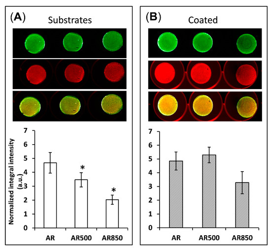 Bone mineralization activity of (A) uncoated and (B) coated samples after 31 days post-seeding of MG63 cells. * p < 0.01 compared to the AR sample. Mineralization was visualized by BoneTag CW800 (green) and cells by CellTag700 (red). * p < 0.05 compare to AR, n = 3.