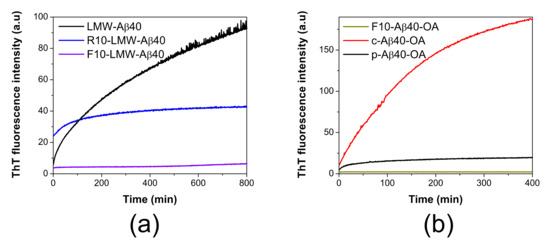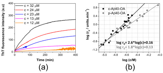 The aggregation kinetics was strongly dependent of concentration. We measured the initial rates of aggregation at different concentrations from the slopes of the ThT kinetic traces extrapolated to time zero, as described in previous studies [16,20,21,29] (Figure 3b). Although the range of concentrations explored for c-Aβ40-OA was smaller than that studied for p-Aβ40-OA, the aggregation process was strongly accelerated for c-Aβ40-OA, i.e., oligomers in presence of the species with a molecular weight lower than 10 kDa. Moreover, the apparent orders of the kinetics, derived from the slope of the double logarithmic plots, were 1.8 for p-Aβ40-OA and 2.6 for c-Aβ40-OA. These analyses reveal that the aggregation processes do not follow first-order kinetics and their rates are strongly dependent of the concentration. The higher apparent order observed for c-Aβ40-OA suggests a higher molecularity for the rate-limiting step of the process.
