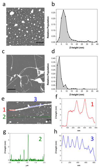 Representative AFM topography image of freshly purified c-Aβ40-OA (c = 25 μM) (a). The Z-height (nm) relative frequencies are represented (b). Representative AFM topography images of c-Aβ40-OA (c = 25 μM) incubated at 37 °C for 5 h (c,e). The Z-height (nm) relative frequencies are represented (d). Section analysis showing the height distribution along the different colored lines (f–h). Scale bars represent 1 μm (a,c) and 200 nm (e).