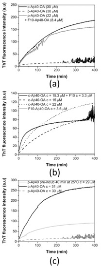 To better understand the differences between the aggregation mechanism of the two types of oligomers, the aggregation kinetics of c-Aβ40-OA and p-Aβ40-OA was further studied by ThT fluorescence at different concentrations using oligomers preparations obtained by incubation of LMW-Aβ40 for 4 h (Figure S4) or for 20 h (Figure 3), with similar results, consistently with the observation that most of the secondary structure and hydrophobicity changes of LMW-Aβ40 occur within the first 120 min of incubation [33].