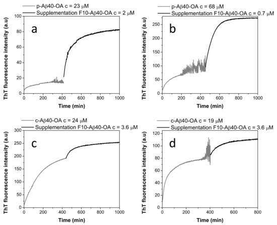 Effect of the supplementation by F10-Aβ40-OA on the aggregation kinetics of p-Aβ40-OA (a,b) and c-Aβ40-OA (c,d) followed by ThT fluorescence. The p-Aβ40-OA and c-Aβ40-OA samples were pre-incubated at 37 °C for 400 min and the ThT kinetics were followed prior to supplementation with F10-Aβ40-OA.