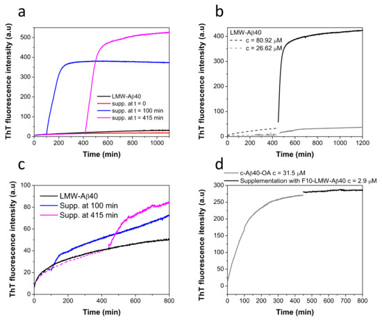 We also investigated whether the capacity to trigger fibrillation already resides in the F10 fraction of disaggregated LMW-Aβ40 or this activity was acquired during the aggregation process. To this aim, we carried out similar supplementation experiments but using the low molecular weight fraction obtained by 10 kDa-cutoff ultrafiltration from freshly prepared LMW-Aβ40 (F10-LMW-Aβ40). This fraction should also contain mainly disaggregated monomeric and dimeric amyloid beta peptides.