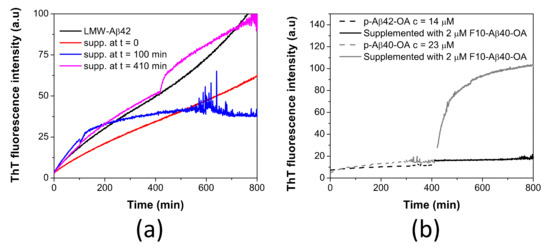 (a) Time dependence effect of the supplementation with F10-Aβ42-OA on the aggregation kinetics of LMW-Aβ42 at c = 40 μM (black line) followed by ThT fluorescence. LMW samples were incubated at 37 °C and supplemented with 1.8 μM of F10-Aβ42-OA at t = 0 (red line), t = 100 min (blue line), and t = 410 min (magenta line). (b) Comparison of the effect of F10-Aβ40-OA on p-Aβ40-OA (grey lines) and p-Aβ42-OA (black lines).