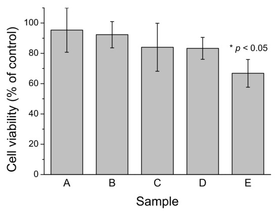 Effect of different Aβ40 preparations on SH-SY5Y cell viability after 24 h treatment. A: c-Aβ40-OA at 20 μM; B: p-Aβ40-OA at 20 μM; C: F10-Aβ40-OA at 12 μM; D: LMW-Aβ40 at 120 μM preincubated 7 h at 37 °C; E: LMW-Aβ40 at 120 μM preincubated 7 h at 37 °C and then supplemented with 2 μM F10-Aβ40-OA. All samples were diluted with an equal volume of culture medium immediately before treatment. Values are mean ± S.E.M. (* p < 0.05).