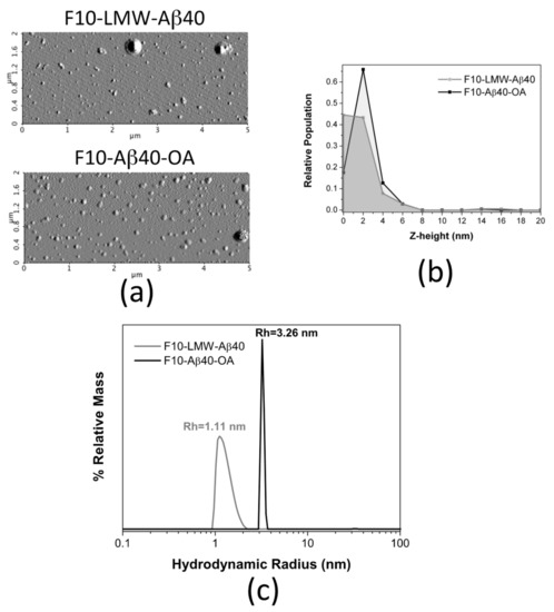 The morphology of the freshly prepared F10 samples was also analyzed by AFM in dry mode (Figure 9a). Although some large aggregates appear sporadically in both samples, most particles appear small and mainly spherical. The height distribution in F10-LMW-Aβ40 shows, mainly, particles between 0 and 2 nm (Figure 9b), attributable to monomer and dimer. Slightly larger spherical particles of 2–4 nm in height predominate in the F10-Aβ40-OA solutions, suggesting the presence of less Aβ40 monomer, associated to particles below 1 nm [41], and a slightly more aggregated state, possibly dimers (Figure 9b).