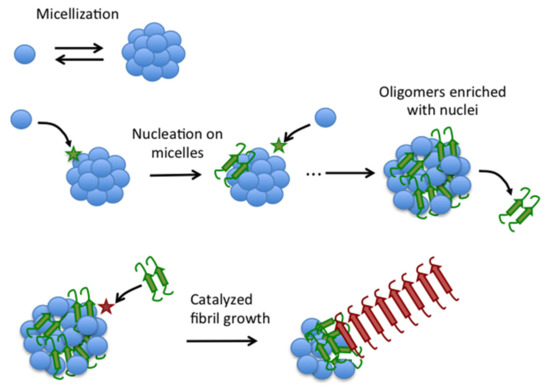 These results suggest that formation of amyloid nuclei needs a bimolecular interaction between both low molecular weight species (monomer or dimer) and larger aggregates (micelles) in solution to be effective.