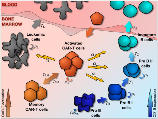 CAR T-cell therapy is the most promising therapeutic option for recurrent B-cell acute lymphoblastic leukemia in children. The recent approval of the first drug by the US and EU drug administrations has culminated three decades of research in adoptive transfer of autologous, genetically modified T-cells. Clinical trials have shown good rates of response and long-term remission. After four generations, the CAR T construct has achieved enough expansion and persistence potential to induce successful responses. The persistence of CAR T-cells in the organism, acting as a surveillance mechanism, is thought to be promoted by the continuous generation of B cells in bone marrow, acting as an endogenous vaccine [24]. The interaction between renewing B cells, CAR T-cells, and leukemic cells in the bone marrow is therefore likely to predict the outcome of the therapy. The lack of extensive bone marrow data due to the more invasive way it must be extracted means that other means of studying these dynamics must be explored.