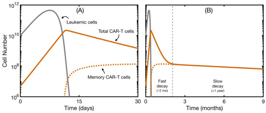Dynamics of leukemic cells and CAR T-cells without new B-cell generation. Simulation of the evolution over time of leukemic cells (solid gray line), total CAR T-cells (solid orange line), and memory CAR T-cells (dotted orange line). In this simulation, we used only Equations (12)–(14), so we observed no recovery of B cells. The initial state was cells, cells, and cells. Parameters were as in Table 1 with day· cell and cells. (A) dynamics for the first month of therapy; (B) dynamics for the first nine months of therapy.