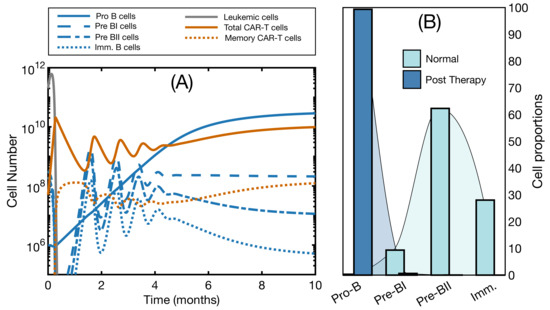 An interesting prediction coming from this simulation is the change in the distribution of the B-cell population as a result of the therapy. In Figure 3B, we see the proportion of cells in each subset in homeostatic conditions and the new distribution after therapy. In the latter, B cells were mainly composed of the CD19− Pro-B cell compartment, and the remaining compartments were ordered according to their maturation stage. In normal conditions, the Pre-BII compartment is the most abundant, followed by the immature compartment [38,40]. Reports of successful CAR T therapy in B-cell malignancies indicate BCA in peripheral blood as a marker of therapy response [14,15,16]. While this seems to be in contradiction with the results presented here, where we observe a recovery of B cells, this is actually due to the sensitivity of clinical detection. Indeed, here the immature compartment in the steady state after therapy is composed of approximately cells, barely of the total bone marrow capacity. This means that the small number of B cells in blood would go undetected. Thus, BCA in peripheral blood would be compatible with the attempts at B cell recovery in the bone marrow.