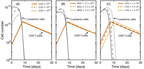 - Pérez-García, V.M.; León-Triana, O.; Rosa, M.; Pérez-Martínez, A. CAR T-cells for T-cell leukemias: Insights from mathematical models. Commun. Nonlinear Sci. Numer. Simul. 2021, 96, 105684. [Google Scholar] [CrossRef]