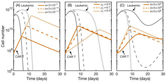 In order to reproduce this scenario, we explored the space of parameters delimited by , the killing capacity of CAR T-cells; h, the activation threshold; and , the proliferation rate, the three parameters related to CAR T-cells and their action. We first simulated the model for different values of one parameter while keeping the other two constant. Results for the first 30 days of treatment are shown in Figure 5. Contrary to what happened with the initial state, here we observed changes in fold expansion and time to peak expansion. Intuitively, shorter proliferation rate (B) and higher activation threshold (C) led to delayed expansion, in some cases being unable to control the malignancy. In fact, products with a high activation threshold may lead to therapy failure in cases of low presence of CD19-bearing cells (Figure S3). On the other hand, lower killing capacity implied increased expansion. The explanation is clear in the light of the model equations: when the CAR T-cells were unable to eliminate leukemic cells, the activation function remained active and proliferation continued, until there were enough CAR T-cells to reduce the leukemia burden.