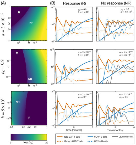 We next aimed to analyze the influence of simultaneous perturbation of two parameters. This can not be done as in the previous figures since it is not possible to distinguish which parameters are responsible for which changes in the dynamics. For this reason, we chose to analyze their influence not on the dynamics but on the final state of the simulation: response vs. no response. The goal was to identify regions of the parameter space related to either endpoint. In Figure 6A, we show the number of leukemic cells at day +30 (), in logarithmic scale, for pairwise combinations of parameters , and h, while keeping the excluded parameter constant. The first month is the time at which bone marrow is first monitored after infusion [14,22]. Each parameter range was discretized into 200 evenly spaced values (linearly spaced for and logarithmically spaced for and h). We note that the killing capacity was the least important parameter, observing more variation over the ranges of the activation threshold and proliferation rate. As seen in the previous figure, higher proliferation rates and lower activation thresholds were required for a complete response. To illustrate the evolution with the time of CAR T-cells, leukemic cells, and B cells in these scenarios, Figure 6B gives six examples of the results of the model simulations for the first six months of treatment. The three CD19+ B-cell compartments , , and are plotted together. For each heatmap, we show an example of a responding (R) and a non-responding (NR) patient. Responding patients were defined by the absence of leukemic cells at day 30 (). Non-responding patients are defined as those with the presence of leukemic cells on that same day (). The interesting feature of this figure is in analyzing the variety of possible responses. The three responding patients displayed here showed similar behavior, comparable to that of Figure 3: Expansion followed by decay and oscillations. We found that the disease could be controlled for a range of fold expansions. The relative proportion of activated to memory cell was constant, since we were not modifying transition rates and . The level of steady state CAR T-cells did change and was related to the magnitude of the initial expansion. For the non-responding patients, we observed more variety. First of all, disease recurrence can occur for different magnitudes of expansion, from one to three orders of magnitude (bottom and middle subfigures, respectively). Secondly, this recurrence is detectable from the first to the third month after infusion (top and middle subfigures, respectively). The level of B cells increased at the time of relapse, while responding patients (left column) showed no increase. This supports the reported association between BCA and therapy response (B-cell recovery indicates a possible relapse). Leukemic cells and CAR T-cells were also subject to the oscillations that were observed in responding patients, and correspond to cycles of reactivation and decay. Although this model is not reducible to a Lotka–Volterra model, due to the existence of an activation function, these cycles can be interpreted in the same way: an increase in leukemic cells occurred after the decay of activated CAR T-cells, which then regrew in response to the recurring clone. Interestingly, in some cases, the therapy was able to control the disease after relapse. This behavior has been observed in simulations of simpler models. In previous work [36], we already remarked that this scenario would not be observed in the clinical context due to the prompt actions taken after any signs of disease recurrence. Therefore, while from the dynamical point of view one could describe some cases as ‘Delayed Response’, from the clinical point of view, they would still be considered as ‘No Response.’ Finally, leukemic cells and CAR T could also coexist in equilibrium (top subfigure, NR column).
