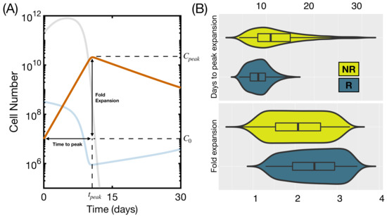 We finally analyzed the influence of simultaneous perturbations of the three parameters. We run 4000 simulations with , h and varying in the ranges specified throughout this section. Specifically, we took 10 evenly spaced values of in the interval 0.4–1; 20 logarithmically spaced values of in the range – and 20 logarithmically spaced values of h in the range –. We identified responding and non-responding patients as explained above and computed the level of expansion of CAR T-cells, defined as , and the time to peak expansion for each group. Results are shown in Figure 7. This particular range and number of simulations yielded a proportion of responding to non-responding patients of 80 to 20, similar to the early response rate recorded in clinical trials [17]. Non-responding patients took longer to achieve the maximum level of CAR cells and had lower fold expansion (Figure 7B. , Wilcoxon rank-sum test).